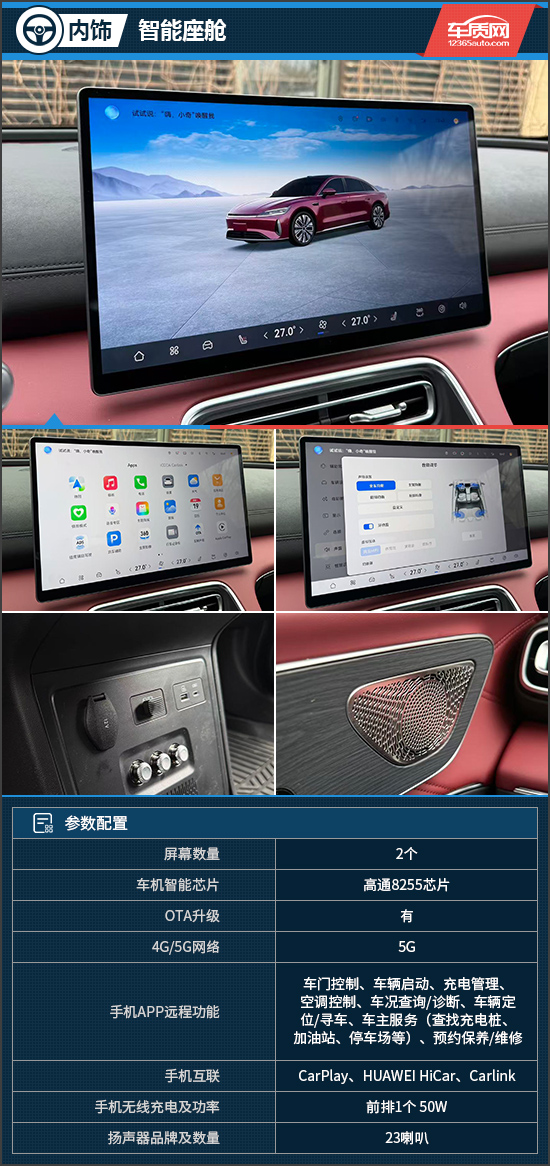 15.6英寸悬浮式中控屏以90%超高屏占比配合10.7亿色显色能力,视觉表现颇为惊艳。车内搭载灵犀智舱2.0系统,内置高通8255芯片并集成AI大模型语音交互。屏幕下方配备50W手机无线充电面板,并附有手机遗忘提醒功能。此外,全车搭载23扬声器伯牙之音音响系统,依托7.1.4全景声布局与AI智慧音效算法,带来沉浸而富有层次的听觉体验。