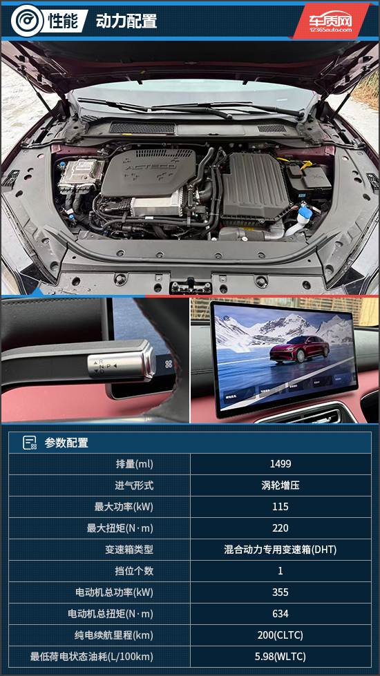 评测车搭载鲲鹏超能电混CDM 6.0动力系统,由1.5T涡轮增压发动机+前后双电机组成,发动机最大功率115kW,最大扭矩220N·m;电动机总功率355kW,总扭矩634N·m,CLTC纯电续航里程为200km,官方零百加速时间仅为4.9s。