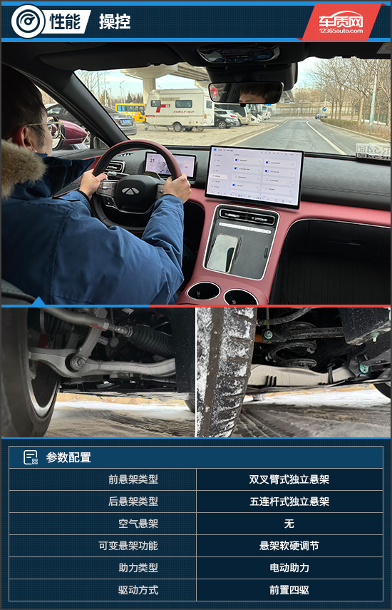 评测车采用前双叉臂式独立悬架+后五连杆式独立悬架的组合,并配备AI磁悬浮数字底盘,具备道路主动预瞄功能,可实现每秒1000次路况扫描与100次实时调节,在舒适度与支撑性之间取得出色平衡。
