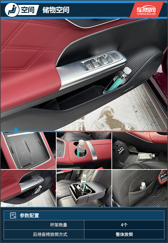 储物空间方面,中控台除配备手机无线充电面板外,下方还采用掏空设计,便于收纳随身挎包等较大物品。前后排杯架内均设有限位器,有效稳固不同尺寸的水杯或饮料瓶,在实际使用中显得尤为贴心。