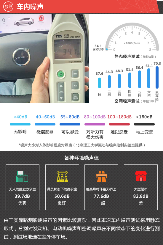 在静态噪声测试环节,2026款沃尔沃XC70在启动状态下车内实测噪声值为34.1dB,在测试过的同级别车型中处于中游水平。