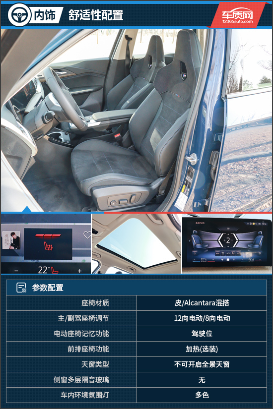 舒适性方面,前排M运动座椅采用皮/Alcantara混搭材质,靠背带有发光M标识,其造型符合人体工程学,可为前排乘员提供出色的包裹感。另外,评测车还选装了前排座椅加热功能,进一步提升座舱舒适性体验。