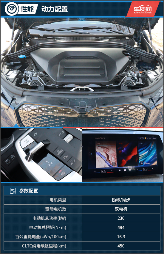 动力方面,评测车搭载第五代eDrive电驱技术,采用前后双电机四驱布局,电动机总功率230kW,电动机总扭矩494N·m,CLTC纯电续航里程450km,官方零百加速时间仅需5.7s。