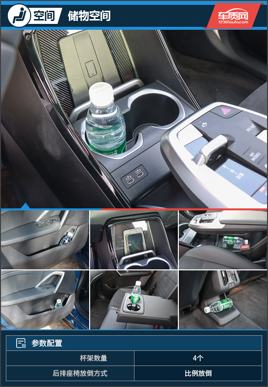 储物空间方面,前排中控台的前方设置了两个水杯架,再往前则设置了斜置的手机无线充电槽。后排空调出风口的下方提供了1个开放式储物槽,方便放置手机等随身小物件。放下后排中央扶手,内置两个带限位器的水杯架,完全能够满足日常出行的使用需求。