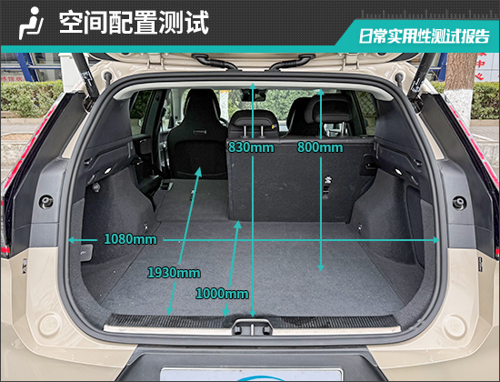 对于评测车后备厢的基础数值,我们也进行了实测,开口长度为830mm;开口宽度为1080mm;后备厢进深为1000-1930mm;后备厢地台与顶部的垂直高度为800mm。