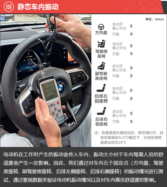 在静态车内振动测试环节,启动后静止和负载两种状态下,评测车所有测试位置的振动数值均为0,表现非常出色。