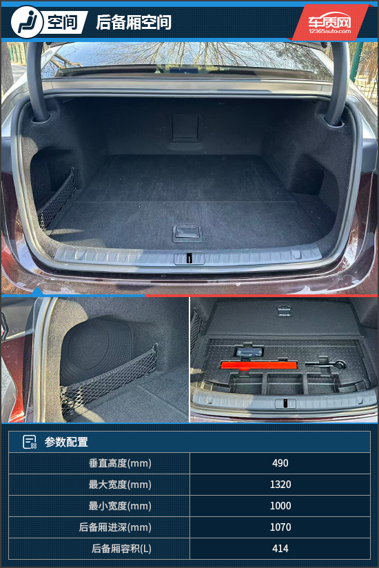 后备厢方面,内部非常规整,常规状态下容积为414L,可从容收纳4-5个登机箱。此外,左侧设有一个储物空间,盖板下方还采用掏空处理,能够进一步拓展储物功能。