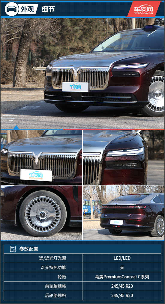 细节方面,岚图追光 L全系标配LED光源远/近光灯,并配有自动头灯、自适应远近光以及场景灯语功能。值得一提的是,评测车选装了20英寸光辉轮毂,其搭载的悬浮车标可在轮毂转动时始终保持静止,颇具档次感。标配的轮胎来自马牌PremiumContact C系列,主打舒适静音、低滚阻和环保性能,具体规格为245/45 R20。