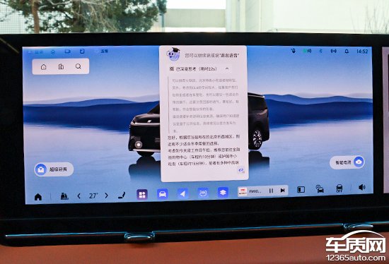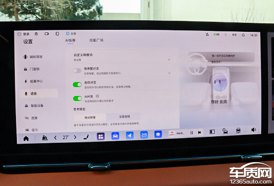 语音交互方面,评测车支持语音免唤醒词、四区域唤醒识别、连续识别以及可见即可说。得益于AI大模型的接入,语音交互系统具备深度思考的能力,内置快问快答和深度推理两个选项。实测来看,虽然后者的思考时间明显偏长,但是反馈的内容也确实也会更加丰富。