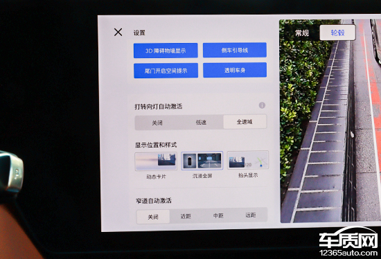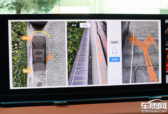 评测车配备360°全景影像以及透明底盘/540°影像,支持多角度显示,包括常规、广角以及轮毂。实测影像画面清晰度较高,对于畸变的控制也很出色。功能性方面,影像画面内带有随动倒车辅助线以及车辆与障碍物的实时距离数字提示,能够为驾驶员提供参考。