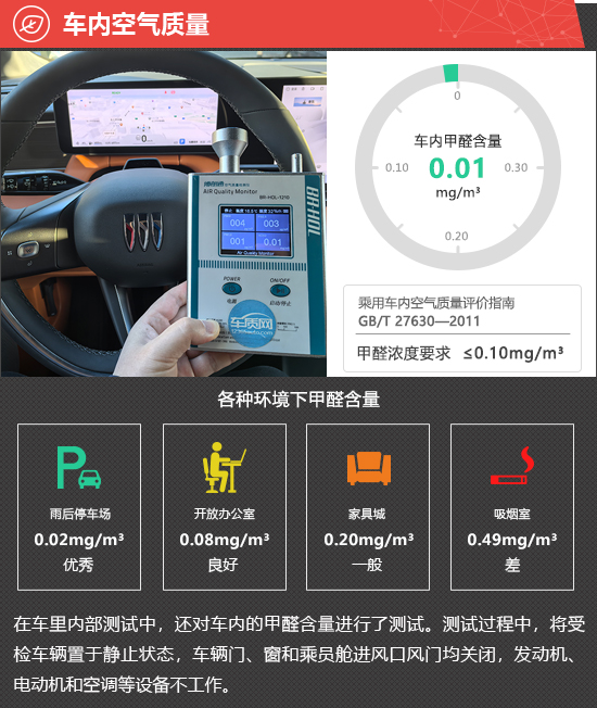 在车内空气质量测试环节,将车辆放置在车辆较少的内部地面停车场中,实测2026款别克至境世家的车内甲醛含量为0.01mg/m3,符合2012年3月1日起实施的,由原环保部和国家质量监督检验检疫总局联合发布的《乘用车内空气质量评价指南》(中华人民共和国国家标准GB/T 27630-2011)中的相关标准。