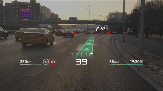 这套HUD和其它产品最大的区别,就在于它利用环境感知更准确的能力,做出了一条能直接“铺”在车道上的动态光带,就像赛车游戏里铺在车道上的发光轨道一般,指引效果比传统HUD直接投射平面图标的方式更好,而且光带的指引理论上和具体车道吻合,还能适应环岛指引这样的复杂路面。为了避免走错路,它甚至还会给其它车道打上红色的“X”,可见指引精确度之高。