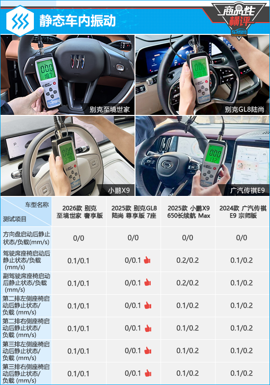 在静态车内振动测试对比环节,别克GL8陆尚再度以微弱优势取胜,方向盘和全车座椅在启动后静止状态下的振动数值均为0,全车座椅在负载状态下的振动数值也仅为0.1mm/s,实际体感轻微。相比之下,小鹏X9前排座椅在启动后静止状态下的振动数值略高于其余三款车型,对测试成绩造成一定影响。