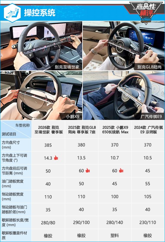 在操控系统测试对比环节,别克至境世家的方向盘尺寸稍大,小鹏X9和广汽传祺E9的方向盘尺寸略小,而别克GL8陆尚的方向盘直径适中,可兼顾操控稳定性和灵活性。方向盘调节方面,别克至境世家在上下可调节角度测试中处于领先地位,别克GL8陆尚和小鹏X9则在前后可调节距离测试中排名并列第一。