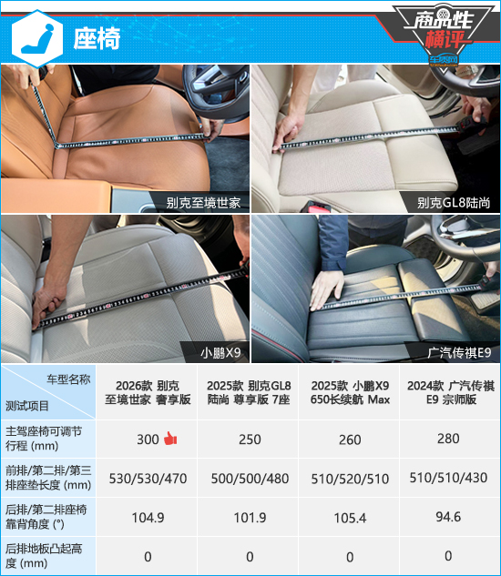 在座椅测试对比环节,根据已测得的数据来看,别克至境世家和广汽传祺E9的主驾座椅可调节行程均达到同级别车型上游水平,其中别克至境世家的测试数值处于绝对领先地位,可以适配更多驾驶者的驾驶习惯。