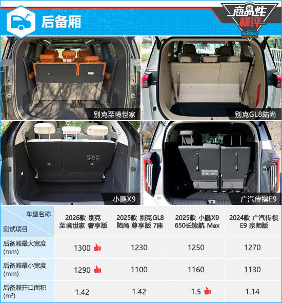 在新能源技术快速迭代的背景下,如今的MPV市场已形成纯电、增程、插混三足鼎立的格局,传统燃油MPV份额持续萎缩。具体到各细分市场来看,这样的趋势在中大型MPV领域尤其明显,自主、合资品牌纷纷开启全动力形式布局。在往期的新车商品性评价中,我们曾经测试过多款新能源中大型MPV。今天我们从中挑选了四款车型,它们分别是别克至境世家、别克GL8陆尚、小鹏X9和广汽传祺E9。本文将通过各项测试数据对比,看看四款车型在商品性方面的表现如何。