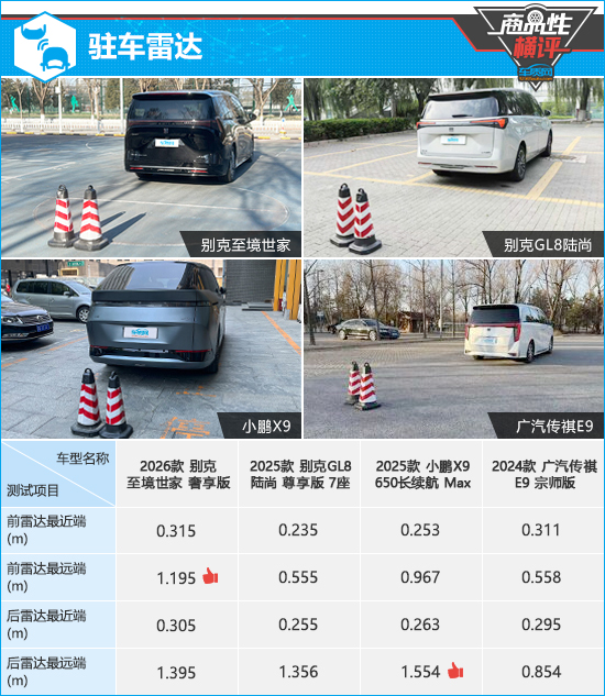 在驻车雷达测试对比环节,根据已有测试数据来看,别克至境世家前雷达探测能力相对较强,最远端数值达到1.195m。小鹏X9后雷达探测能力更强,最远端数值超过1.5m。最近提示距离方面,广汽传祺E9表现相对较好,前后雷达最近端数值与同级别车型测试均值差距较小,而别克GL8陆尚的前后雷达最近端数值与同级别车型测试均值相差较大。