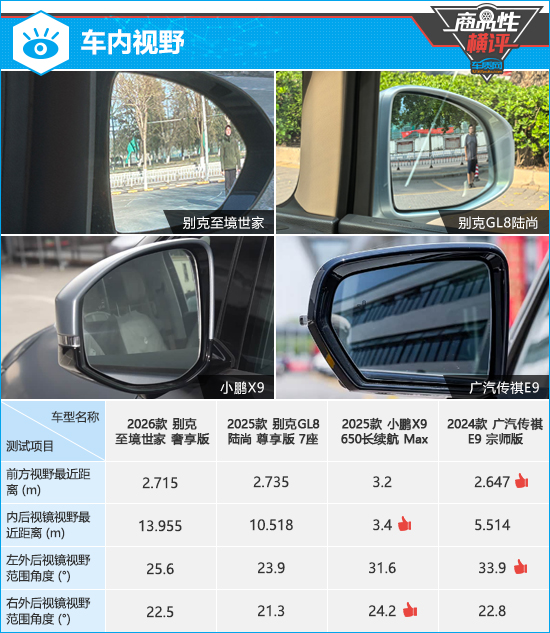在外后视镜视野范围角度测试中,小鹏X9和广汽传祺E9两侧外后视镜测试成绩均达到同级别中上游水平。相比之下,别克GL8陆尚两侧外后视镜测试成绩在四款车型中垫底,未达到同级别车型测试均值。
