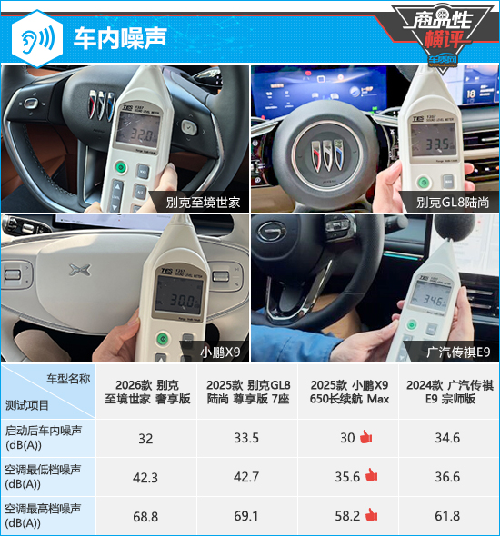 经实测,在启动状态下,小鹏X9对于车外噪声隔绝效果相对不错,实测噪声值为30dB,达到测试仪器的最低值。相比之下,广汽传祺E9车内实测噪声值虽然略高于同级别车型测试均值,但仍处于对人体“无影响”的范围内。