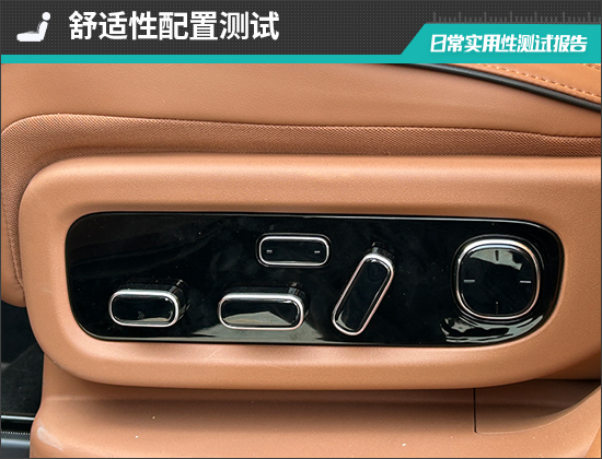 座椅方面,评测车前排座椅调节按键位于座垫侧面,调节按键位置合理,操作便捷。此外,评测车驾驶位和副驾驶位座椅配备三组电动座椅记忆功能;同时,前排和第二排座椅提供加热、通风、按摩和头枕扬声器功能,第三排座椅配备加热和通风功能,舒适性表现出色。