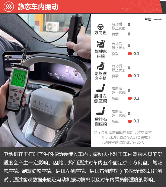 在静态车内振动测试环节,启动后静止和负载两种状态下,评测车方向盘位置的振动数值始终为0,前后排座椅的振动数值也处于相对较低水平且两种状态下变化不大,对乘坐舒适性未造成影响。