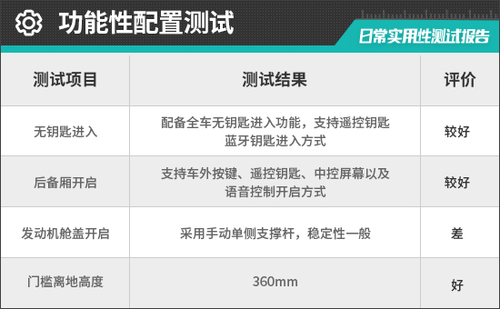 在功能性配置方面,评测车配备了全车无钥匙进入功能,并支持遥控钥匙、蓝牙钥匙进入方式,用户只需携带钥匙靠近车辆便可自动解锁,反之则自动上锁。上述操作在实测过程中并未出现失灵的情况。