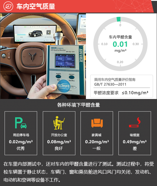 在车内空气质量测试环节,将车辆放置在车辆较少的内部地面停车场中,实测2026款岚图泰山的车内甲醛含量为0.01mg/m3,符合2012年3月1日起实施的,由原环保部和国家质量监督检验检疫总局联合发布的《乘用车内空气质量评价指南》(中华人民共和国国家标准GB/T 27630-2011)中的相关标准。