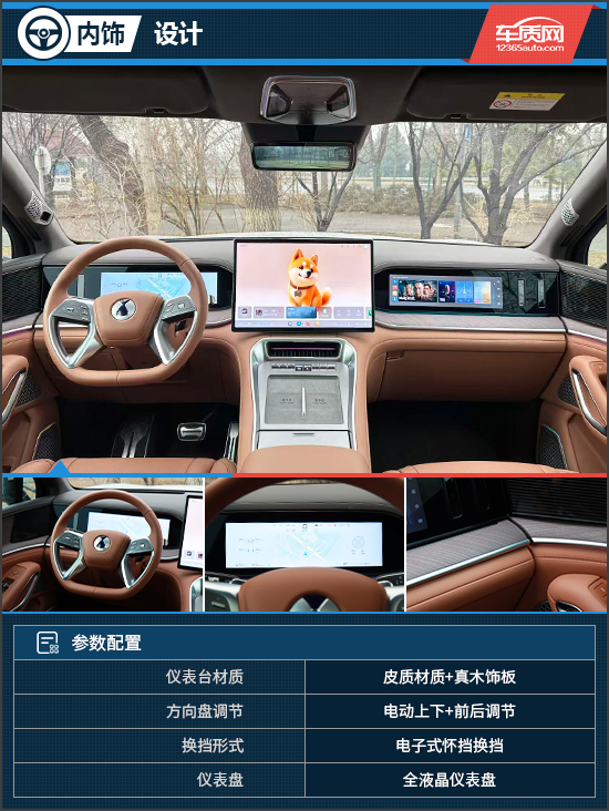 内饰方面,腾势N9整体为对称式布局,左侧为全液晶仪表盘,中间是悬浮式中控屏,右侧为副驾娱乐屏。同时,内饰用料也十分考究,运用了大量皮质材质包覆,再辅以大面积真木饰板以及镀铬装饰,令整个座舱富有科技氛围且不失豪华格调。