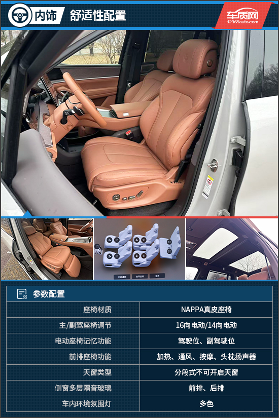 舒适性是评测车的一大亮点,首先座椅采用了NAPPA真皮座椅,触感十分细腻。其次,前排座椅支持加热、通风和按摩功能,副驾还配有零重力座椅,可一键放倒,乘坐体验颇为出色。