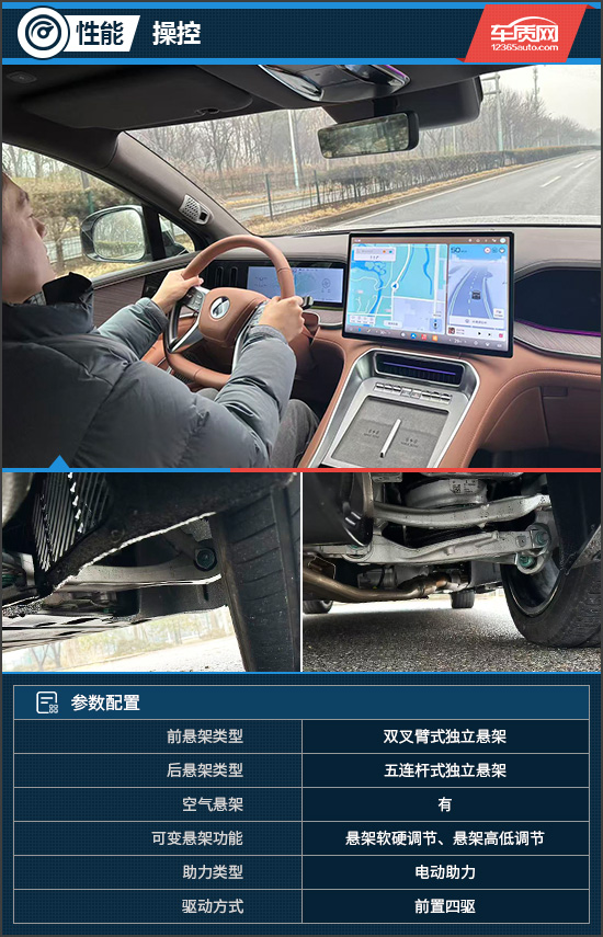 底盘方面,评测车采用前双叉臂式+后五连杆式独立悬架组合,搭配空气悬架以及云辇-A+路面预瞄2.0系统,通过坑坎、减速带时的细碎颠簸可被轻松化解;高速过弯时,车身侧倾也被控制在合理范围,兼顾舒适性与操控稳定性。此外,在侧方停车遇到狭窄车位时,启动智能蟹行模式,可完成四轮协同横向移动,如同螃蟹横行般精准入位。