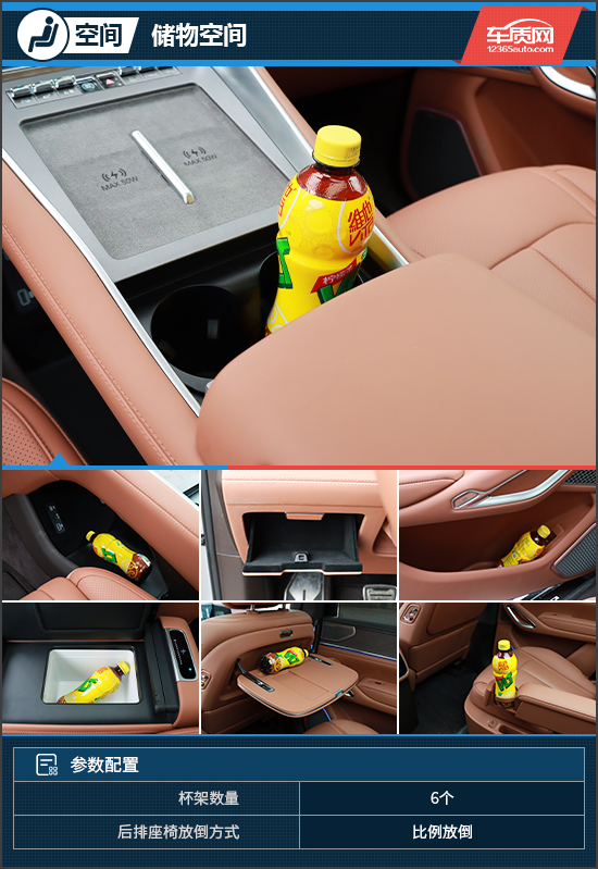 储物空间方面,评测车提供了6个杯架,可以很好地满足车内所有乘客的使用需求。此外,除了常规的储物空间,中控台下方还采用掏空处理,可以放置不少物品并具有一定的私密性。