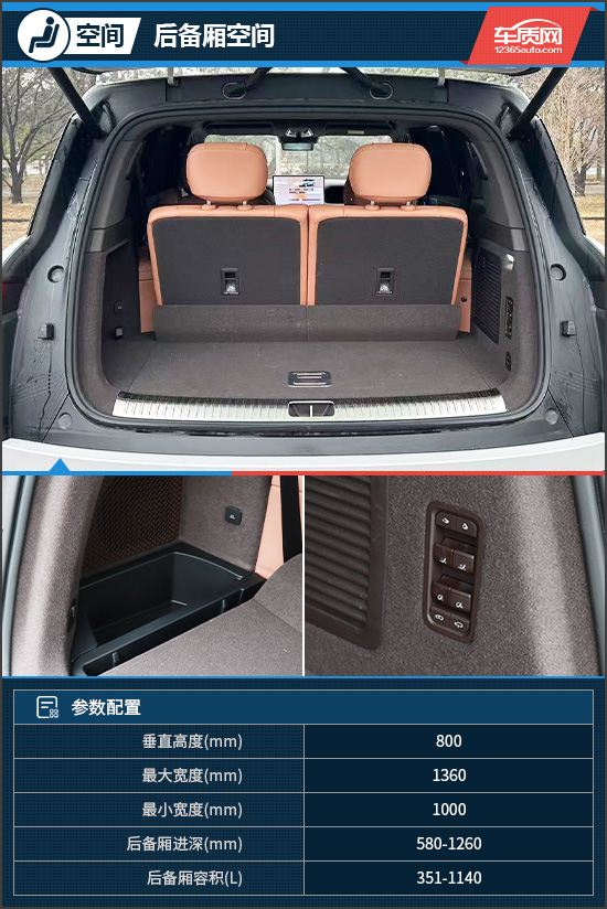 后备厢方面,内部非常规整,常规状态下容积为351L,可从容收纳2个登机箱。而将第三排座椅完全放倒后,可以获得更大的储物空间,便于放置大件物品。值得一提的是,评测车还配备AR脚踩开车门功能,让车主在搬运物品,不方便手动打开尾门时,有了更从容的操作方式。