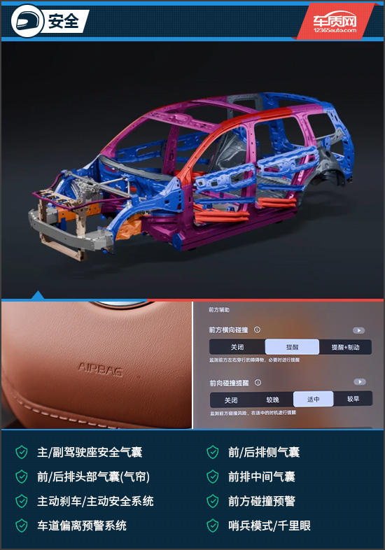 安全配置方面,评测车配备了完善的主/被动安全配置,包括主动刹车/主动安全系统、前方碰撞预警、车道偏离预警系统、主/副驾驶座安全气囊、前/后排侧气囊、前排中间气囊等均没有缺席,整体表现出色。在看不到的地方,评测车还采用了4层热成型钢A柱,最高达2000Mpa,拥有五星安全标准车身。
