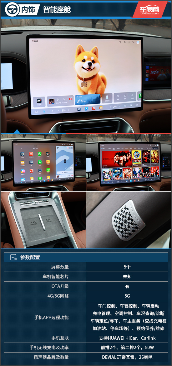 腾势N9全系标配17.3英寸中控屏,分辨率达到2.5K,显示效果细腻,并且车机系统不仅具备六区域语音唤醒识别、可见即可说功能,还接入了DeepSeek应用,拥有更智能的交互表现。中控台上方配备了2个手机槽,拿放手机非常顺手,且均搭载50W无线快充,颇为实用。此外,评测车还配备DEVIALET帝瓦雷扬声器,拥有26个喇叭,并具备杜比全景声,音质表现出众。