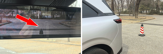 后方视野测试中,依旧将桩桶固定摆放,随后移动车辆直至可以观察到桩桶上沿为止。经实测,得益于流媒体后视镜加持,评测车后方视野所测得的距离为2.733m,在测试过的同级别车型中处于上游水平。