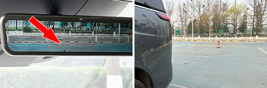 后方视野测试中,依旧将桩桶固定摆放,随后移动车辆直至可以观察到桩桶上沿为止。得益于流媒体后视镜,实测后方视野所测得的距离为8.568m,与测试过的同级别车型相比处于上游水平。