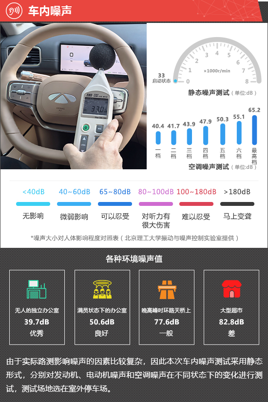 在静态噪声测试环节,2026款奇瑞风云T11在启动状态下车内实测噪声值为33dB,在测试过的同级别车型中处于中游水平。由于评测车搭载增程式动力系统,启动状态下发动机默认不工作,因此无法对2000rpm以及3000rpm的噪声进行测试。