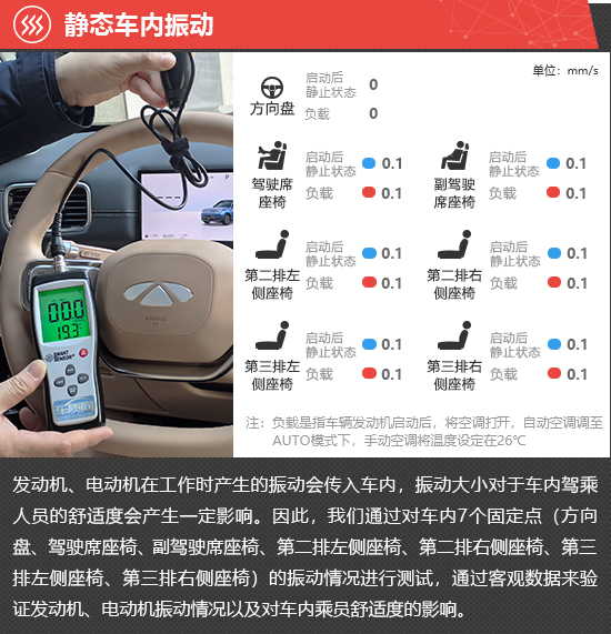 在静态车内振动测试环节,启动后静止和负载两种状态下,2026款奇瑞风云T11方向盘位置的振动数值始终为0,全车座椅的振动数值均为0.1mm/s,并且保持不变,实际体感不明显。