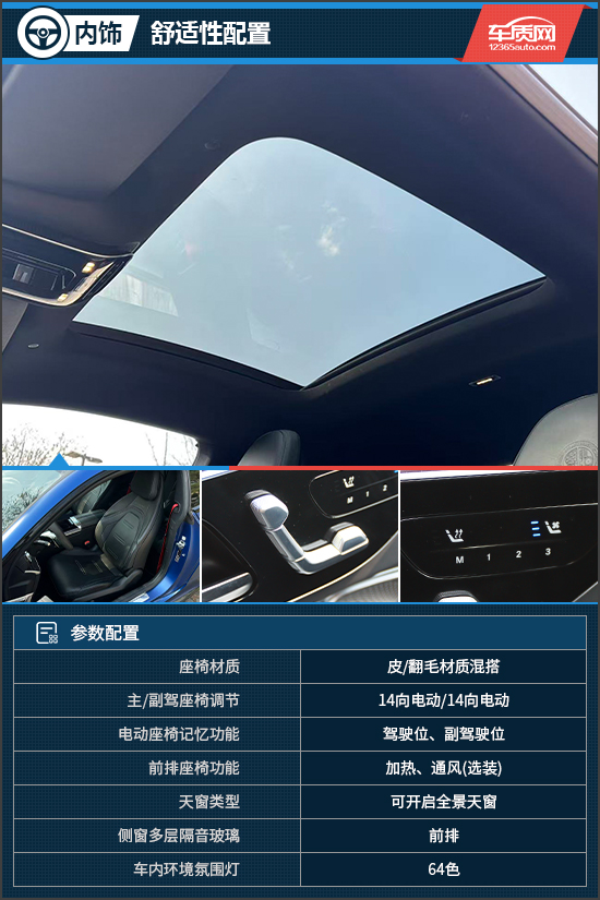 舒适性配置方面,评测车选装了AMG高性能座椅组件高级版,能够为前排乘客提供出色的侧向稳定与支撑,让每一次过弯皆能游刃有余,并且还集成了座椅加热和通风(选装),再搭配可开启全景天窗,整体乘坐体验要好于其他双门跑车。