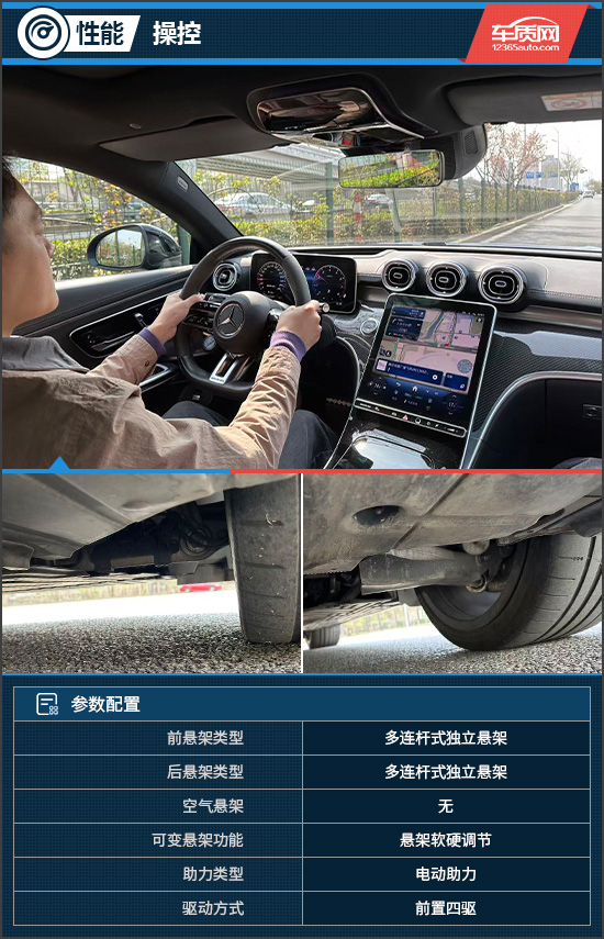 评测车的底盘调校延续了AMG一贯的操控基因,前、后多连杆式独立悬架支持软硬调节,在保证舒适性的同时,对路面细碎颠簸的过滤细腻柔和;高速过弯时,车身侧倾幅度被控制在合理范围内,为驾驶者提供了充足的信心。值得一提的是,尽管评测车采用无框车门,但得益于前排侧窗多层隔音玻璃,在城市行驶中车内噪音控制出色,整体静谧性表现良好,乘坐感受安逸舒适。