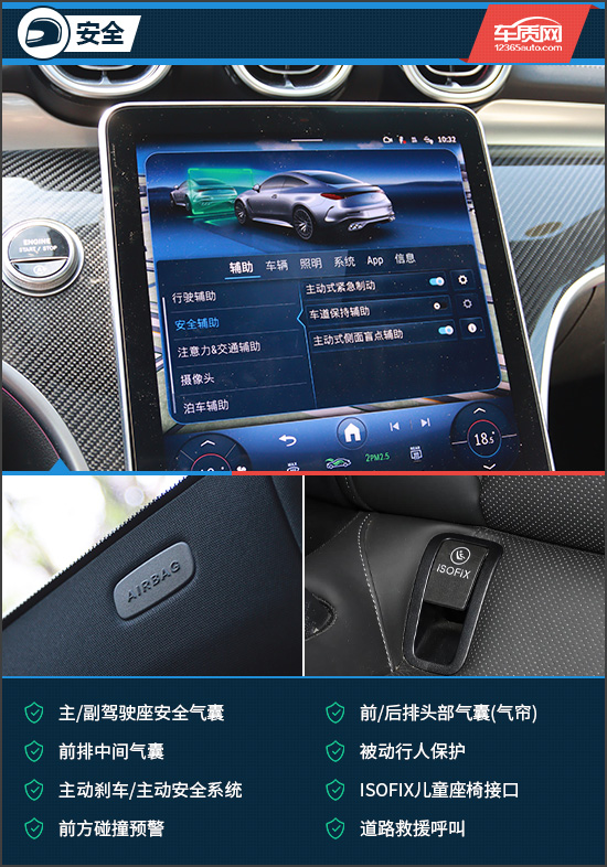 安全配置方面,评测车搭载了丰富的主/被动安全配置。例如前/后排头部气囊(气帘)、前排中间气囊、被动行人保护、主动刹车/主动安全系统、前方碰撞预警等主/被动安全配置在评测车上均有配备,可以有效提升行车安全性。