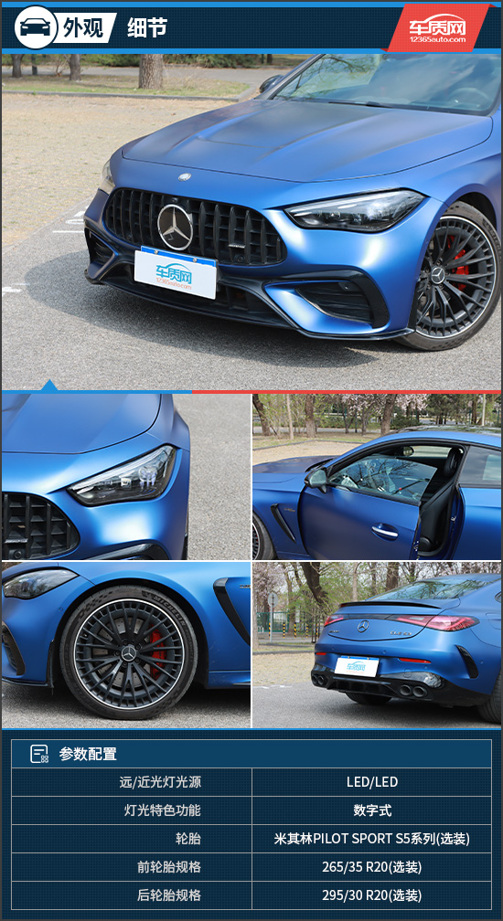 细节方面,评测车的头灯配备了全LED光源,内部还搭载智能数字大灯组件,既可以提高照明距离,又能够最大限度地减少对向车辆驾驶员被眩目的风险,非常实用。轮毂方面,评测车选装了AMG Y辐轻合金轮毂,尺寸达到20英寸,能够为侧面增添不少运动气息,同时,还选装了米其林PILOT SPORT S5系列轮胎,主打运动、操控性能。此外,车尾AMG扰流板的加入,不仅为车身增添了强烈的战斗气息,而且有效降低了后轴升力,进一步提升车辆操控极限。