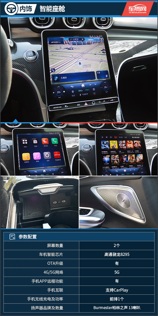 评测车配备11.9英寸中控屏,虽然尺寸不大,但分辨率较高,视觉观感出色。此外,车机内置了高通骁龙8295芯片,性能非常强大,操作响应速度表现优异,同时还支持双区域智能语音助手、应用商店、OTA升级等主流功能。值得一提的是,评测车配备的柏林之声3D环绕立体声音响系统,拥有13个扬声器,音质表现颇为出众。