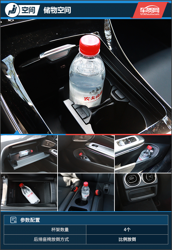 储物空间方面,评测车提供了4个杯架,可以很好地满足车内所有乘客的使用需求。此外,除了常规的储物空间,后排还提供了多个储物格,实用性表现可圈可点。