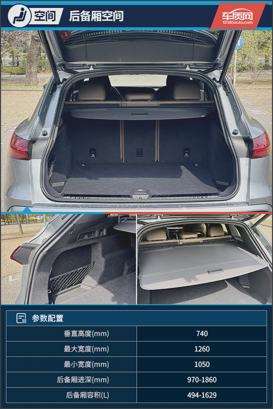 后备厢内部空间较为规整,常规状态下容积为494L,后排座椅放倒后可扩展至1629L,空间拓展能力较强。此外,内部配备网兜、锚点等实用配置,并提供伸缩式置物帘,细节设计较为完善。
