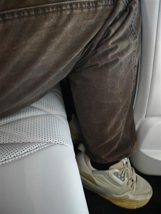 三排乘坐体验就相对比较差了,虽说侧面视野不错,但有个不小的台阶,带来了比较明显的“蹲板凳”感受;绝对空间也一般,具体表现如图。二排三排必须要互相将就才行,我的身高才170cm出头,尚且如此,个子更高的乘客就会有点麻烦了。