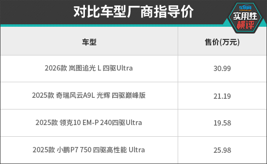 如今,自主品牌在中大型车细分市场持续发力,凭借豪华配置以及新能源技术实现全面向上,逐步打破了传统格局。在往期的《日常实用性测试》中,我们曾测试过不少中大型车,本次挑选的四款对比车型分别为岚图追光 L、奇瑞风云A9L光辉、领克10 EM-P、小鹏P7。接下来就从日常实用性测试的角度进行横评,看看哪款车型的综合表现更好。