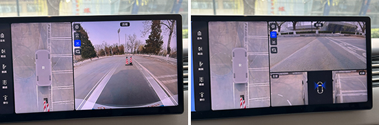 评测车配备了360度全景影像和透明底盘/540度影像,支持多角度查看。经实测,影像显示清晰,车辆周围的畸变控制也在合理范围内;此外,系统还会在泊车过程中自动切换影像角度,方便驾驶者查看车辆周围情况。