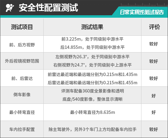 在车辆前、后方视野测试中,车内所有座椅均已调整至最低状态,所测出的数据与驾驶者正常使用时均有一些偏差,仅供参考。