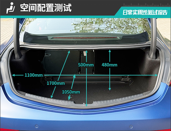 对于评测车后备厢的基础数值,我们也进行了实测,开口长度为500mm;开口宽度为1100mm;后备厢进深为1050-1700mm;后备厢地台与顶部的垂直高度为480mm。